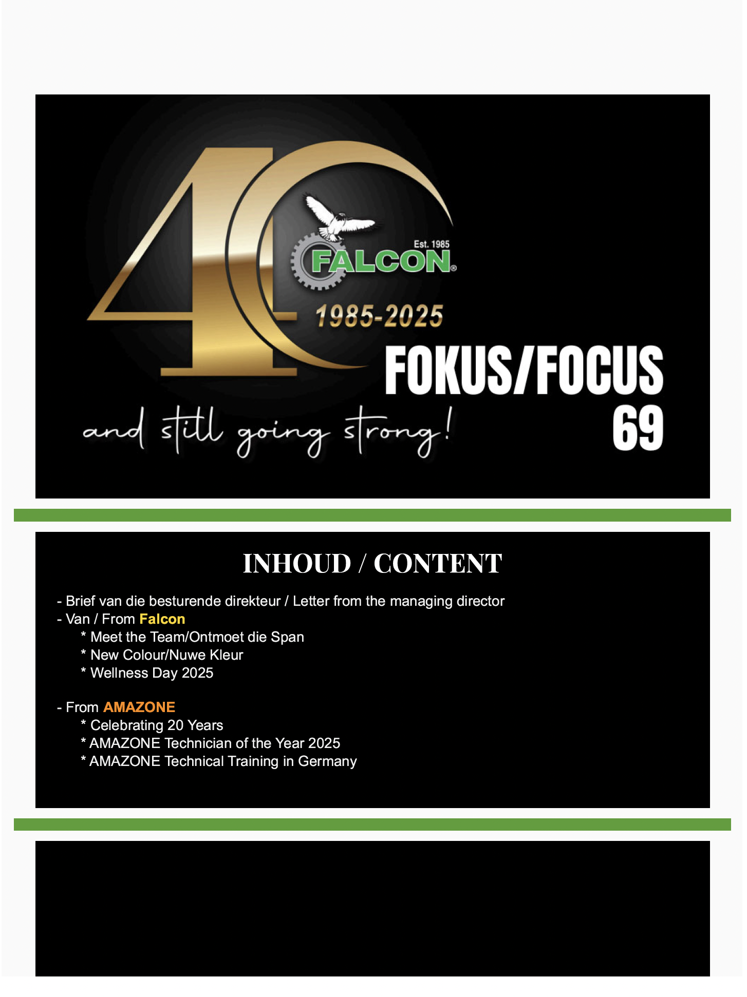 The Falcon Focus is our publication which is sent out to clients, updating them on the latest in our world of agricultural equipment.