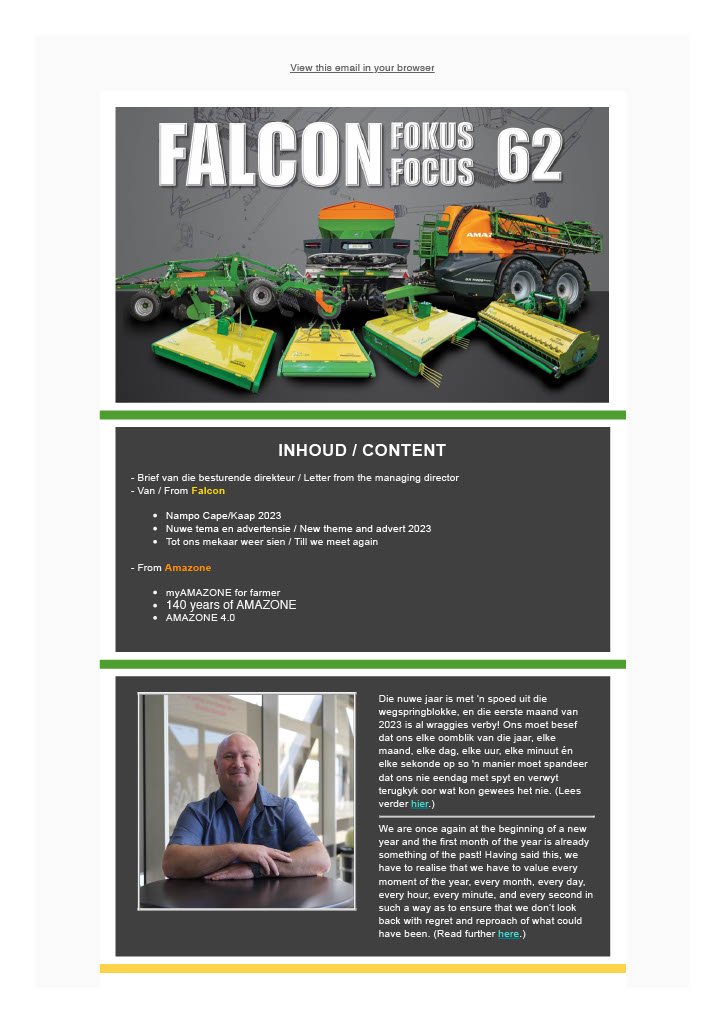The Falcon Focus is our newsletter which is sent out to clients, updating them on the latest in our world of agricultural equipment.
